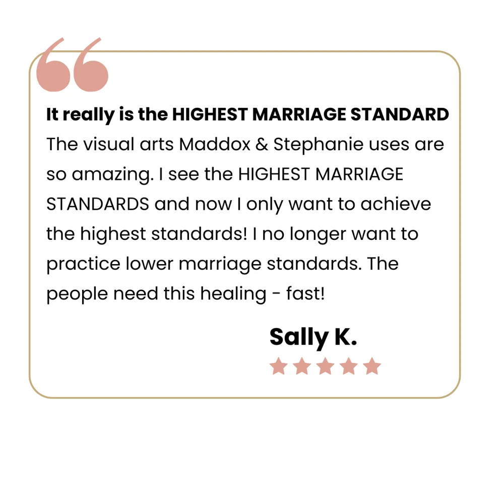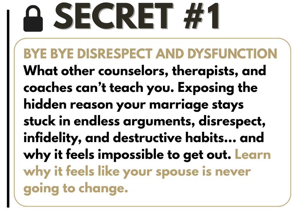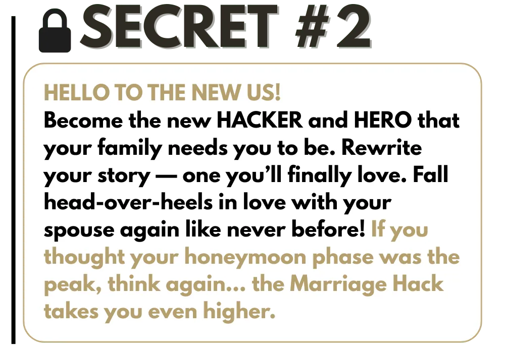 THE #1 SECRET: LEARN WHY 'MARRIAGE HACKING' HEALS MARRIAGES FASTER! Learn the absolute Highest standard of marriage and why the industry continues to promote lower standards as acceptable. You’ll also discover how this contributes to the high divorce rate. Then, you’ll see proof that your marriage is not too far gone!